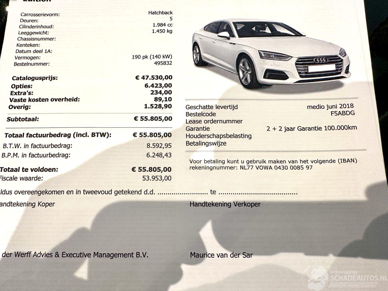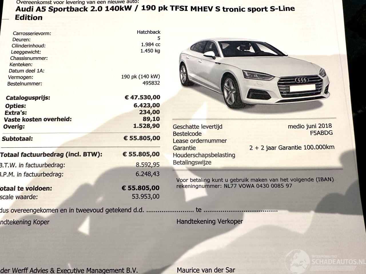 Scherpe meeneemprijs - BTW AUTO - 1e EIGENAAR - 3x S-Line - SLECHTS 135dkm NAP GELOPEN - Deze Audi A5 Sportback 2.0 TFSI MHEV Hybrid Sport S-line Edition komt uit 2018 en kostte toen € 55.805 euro. Deze originele Nederlandse personenauto staat sinds 2018 op kenteken